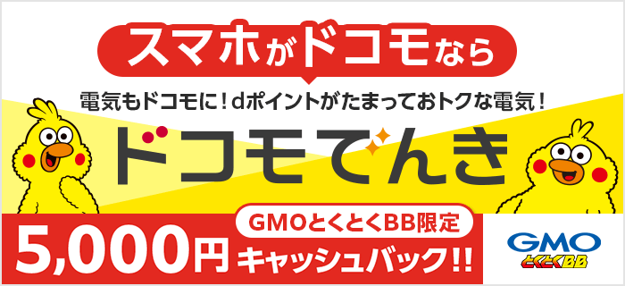 - 2.1 【GMOとくとくBB限定】ドコモでんき申込&開通で5,000円キャッシュバック